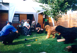 ZuchtstätteDie ersten vier Wochen ihres Lebens verbringen die Welpen in ihrer Wurfkiste bei uns im Wohnzimmer, im Kreis der Familie.Danach ziehen sie in das geräumige Welpenhaus im Garten um. Dort haben sie eine große Wiese mit vielen Spielmöglichkeiten, mit optischen und akustischen Reizen, zur freien Verfügung. Unsere Hündinnen erziehen ihre Welpen gemeinsam; viele Besucher ermöglichen eine optimale Prägung der Welpen in dieser wichtigen Zeit. Durch intensive Gespräche versuchen wir den richtigen Welpen in die richtige Familie zu geben. Unseren Welpenerwerbern stehen wir ein Hundeleben lang mit Rat und Tat zur Verfügung.